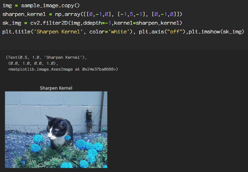 Here, the kernel created is for sharpening the image, and I am using a 3×3 kernel for this process. To apply the kernel to the image, the function cv2.filter2D() is used, the ddepth parameter is set to -1 to keep the image format the same as the source, and lastly, the kernel used is the sharpen_kernel created as a numpy array.