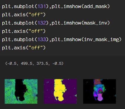 The first image is the mask created using the threshold ranges using bitwise_and(). The next image is the inverted mask, created with bitwise_not(). The third is the image with the inverted mask thresholds applied to the image, blending with a second copy of the image.