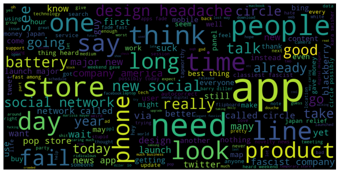 Next, I assessed the NLTK stopwords list and decided to add the brand and products to the stopwords and to remove ‘not’ from the list in the case that later, when I apply the n-grams parameter to my process, ‘not’ combined with the surrounding terms could help my network perform better. I also removed ‘sxsw’, and ‘austin’ because the dataset relates to the SXSW event in Austin, Texas. I didn’t want this to affect my assessment of the terms related to sentiment.