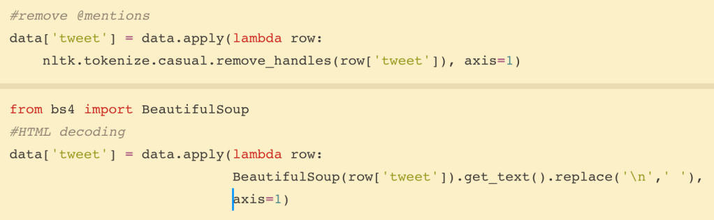 Then, I applied the following functions to my dataset to get rid of the @mentions(Twitter user handles) and to decode the HTML, I used BeautifulSoup.