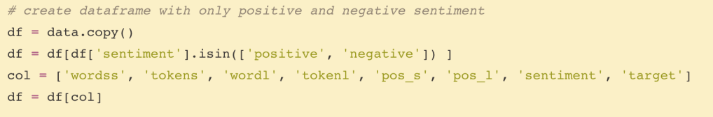 I processed my entire dataset, including the neutral and unknown sentiment categorized tweets. Next, I create a new Pandas dataframe that only contains the categories I plan to assess, which is positive and negative sentiment categorized tweets.