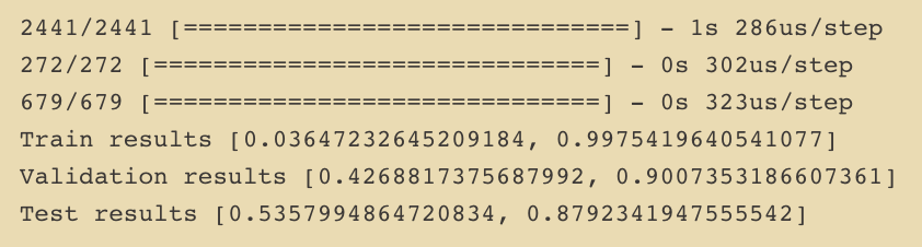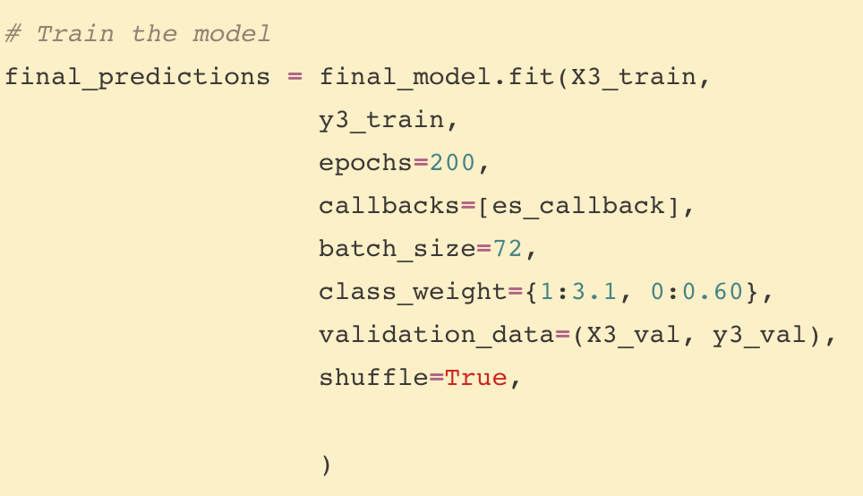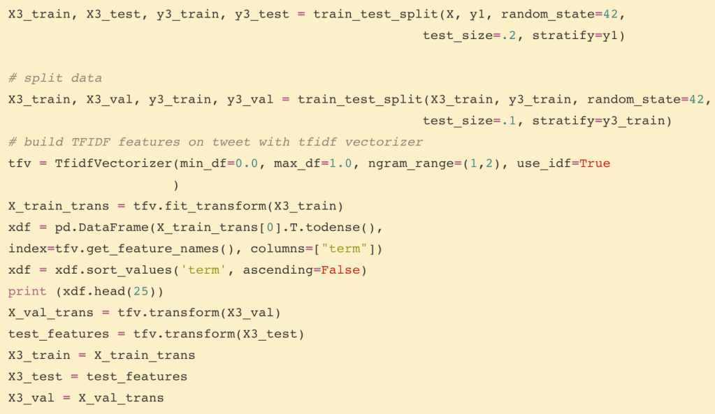 Now, I begin my model process by splitting my data into train, test, and validation sets. Then, I fit the TfidfVectorizer to my training data, and transform all of the data according to the fit to the training data. Then, I get the class weights for the sentiment classes to plug into my compile step.
