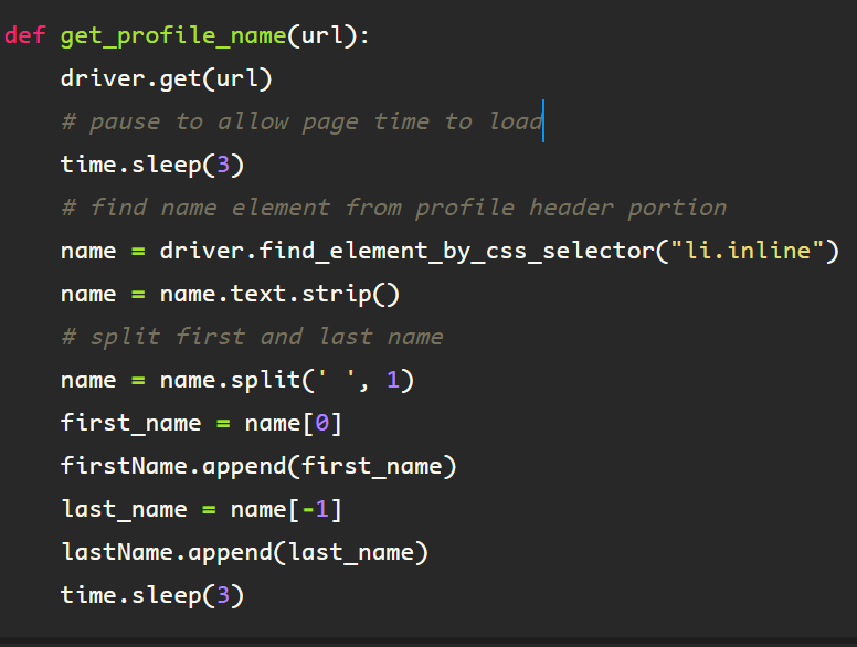 From here, I got the text from the element, and split the string on the remaining center whitespace, which separates the first name from the last name in a list, from which I extract the variables ‘first_name’ and ‘last-name’.