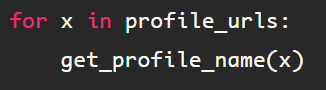 Next, I will assign the url of a profile, as a string, as variable ‘profile’, followed by the line telling the WebDriver to ‘get’ the url.