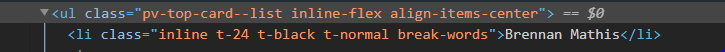Then to get the name from the element, I simply find the first element under the above tag using the list tag ‘li’, class name, ‘inline’, as the first occurrence contains the innerText attribute containing the name string. I assign the variable ‘name’ to this.