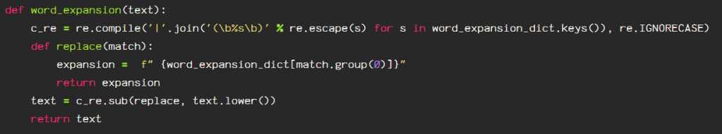 There are other options, for instance, removing the punctuation before processing the contractions will allow for a shorter dictionary, however, when the punctuation is removed, sometimes, these contractions end up being a completely different word. An example of this is “she’ll”, which would become “shell”, and these words have completely different meanings. So I process the expansion before cleaning the punctuation from the text so that the word meaning is not lost, as that is the entire point of NLP. Using the following function, I use regex to compile the dictionary keys, then I match the contraction to the correlating expansion phrase or word, then follow up with the regex ‘sub’ function, returning the text replacing the contraction.