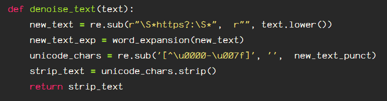 Next, I will remove the ‘noise’ from the text. Noise includes emojis, punctuation, and URLs. I am also running the contraction expansion function in this block of self explanatory code:
